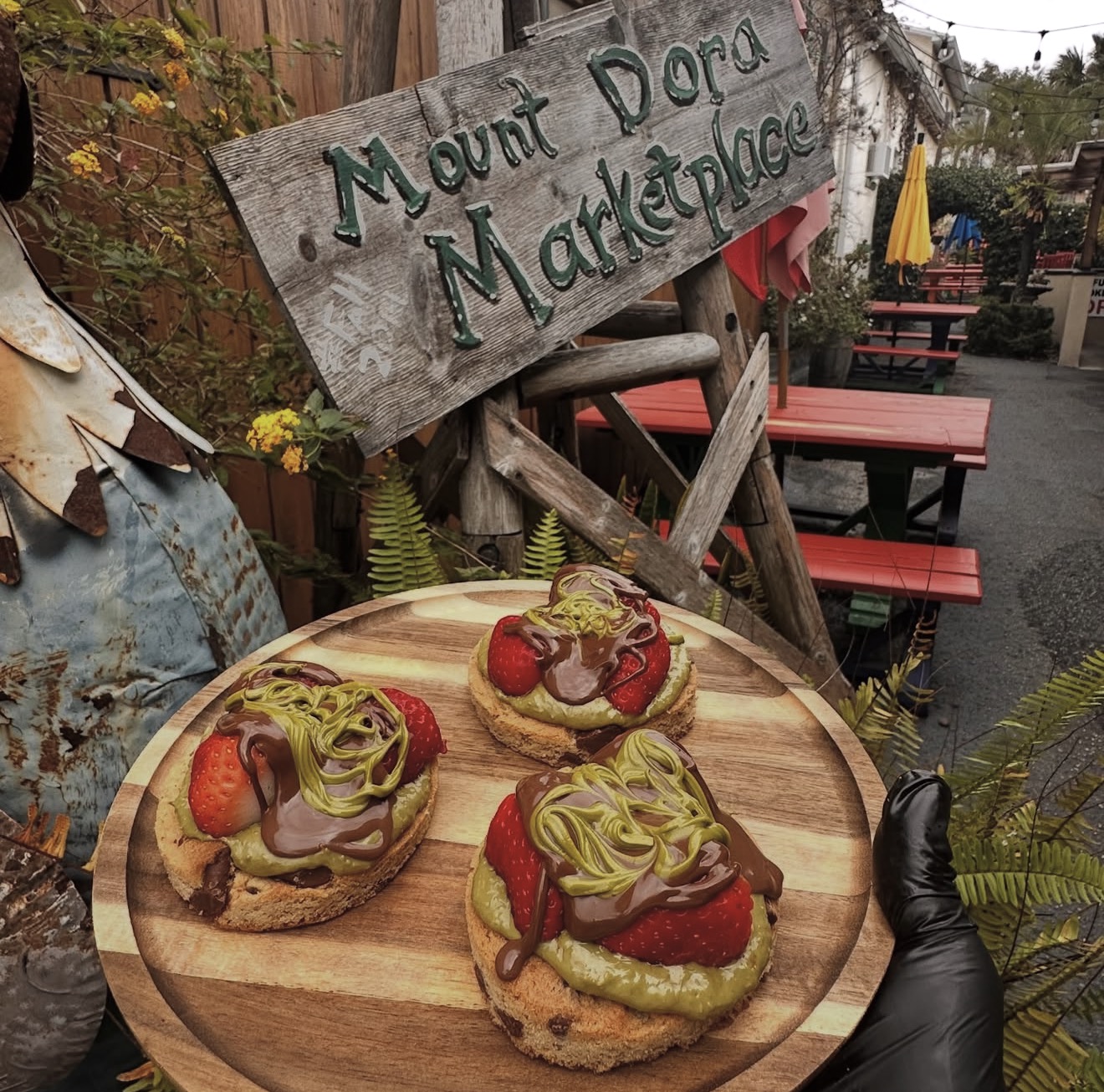 Soft cookie, pistachio cream, fresh strawberry, chocolate drizzle.